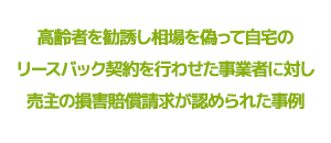 高齢者を勧誘し相場を偽って自宅のリースバック契約を行わせた事業者に対し売主の損害賠償請求が認められた事例