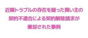 近隣トラブルの存在を疑った買い主の契約不適合による契約解除請求が棄却された事例